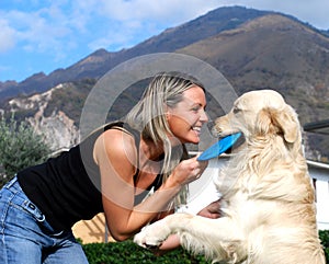 White dog and happy girl