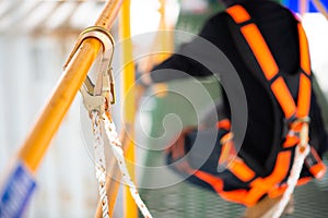 Construction worker wearing safety harness and safety line working on construction