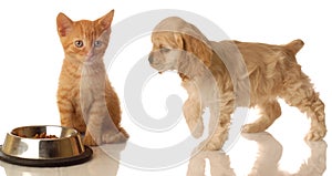 Puppy and kitten with food