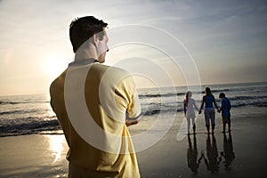 Man watching family at beach