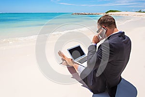 Businessman working with computer and talking on phone on the beach