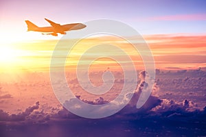 Airplane in the sky at sunrise