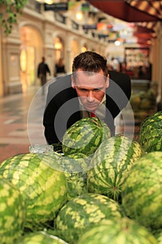 Man smelling watermellons in shopping-centre