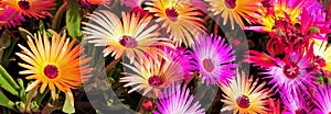 Floral border of beautiful flowers and green eucalyptus leaves on gray table top view. Flat lay composition.