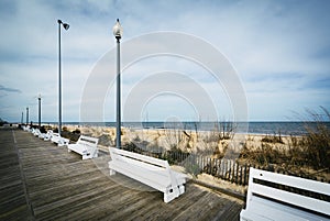 Benches on the boardwalk in Rehoboth Beach, Delaware.