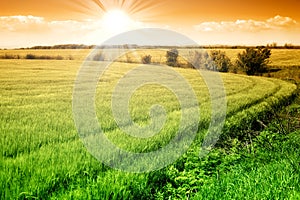 Field of green fresh grain and sunny sky