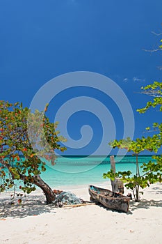 Thailand summer travel sea, Thai old wood boat at sea beach Krabi Phi Phi Island Phuket.