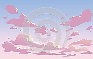 Vector landscape blue sky and clouds. Sunset. Anime cartoon clean style.