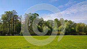 Manicured lawn in a neat Park with trees in the background