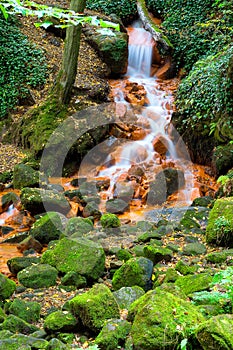 Waterfall in the autumn, colorful leaves on the ground