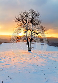 Alone tree in winter sunrise landscape - nature