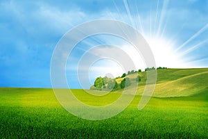 Summer meadow field. Nature background with sun, sunny rays, grass landscape