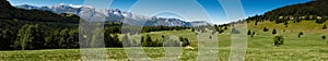 Panorama landscape with sun and forest and meadow at sunrise