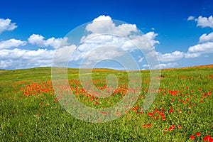 Green landscape with corn field and blue sky
