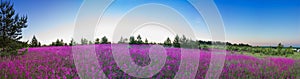 Summer landscape with the blossoming meadow, sunrise
