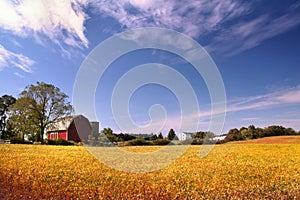 Colorful Autumn landscape - river waterfall in colorful autumn forest park with yellow red leaves