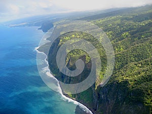 Aerial landscape view of shoreline at Na Pali coast, Kauai, Hawaii
