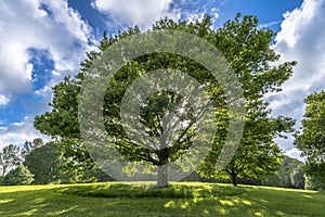 Autumn leaves background, backdrop. Landscape, Leaves swinging in a tree in autumnal Park. Fall. Oak trees with colorful leaves