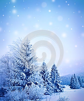 Beautiful male and female noble deer in the snowy white forest. Artistic Christmas winter image. Winter wonderland.