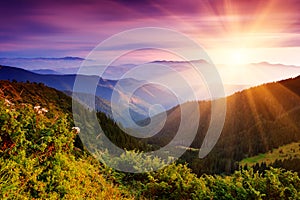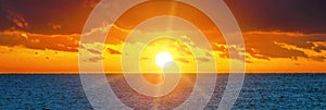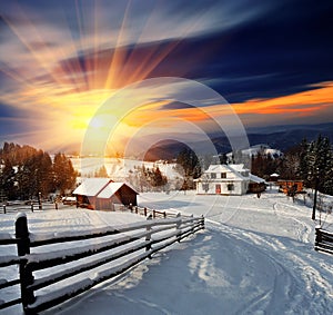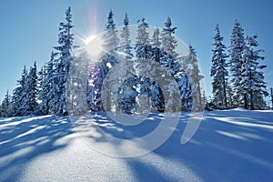 Frosty Christmas morning. Winter landscape with frosty trees lit by the morning sun. Winter panorama in orange blue colors. Winter