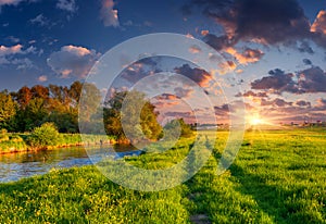 Aerial drone view of green fields and farm houses near canal, typical Dutch landscape, Holland, Netherlands