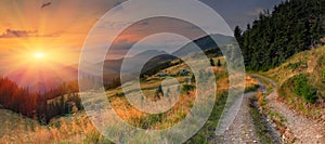 Road to desert landscape at sunset with cactus and hills silhouettes background