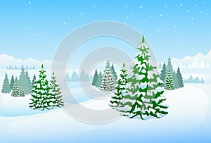 Frosty winter landscape in snowy forest. Pine branches covered with snow in cold winter weather. Christmas background with fir