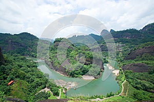 A Colorful Wide Angle Shot of Beautiful 40-Acre Lake with Summer Yellow Lotus Lilies, Blue Skies, White Clouds, and Green Foliage