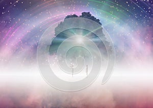 Man and woman silhouette standing opposite, tree of life, tree of knowledge